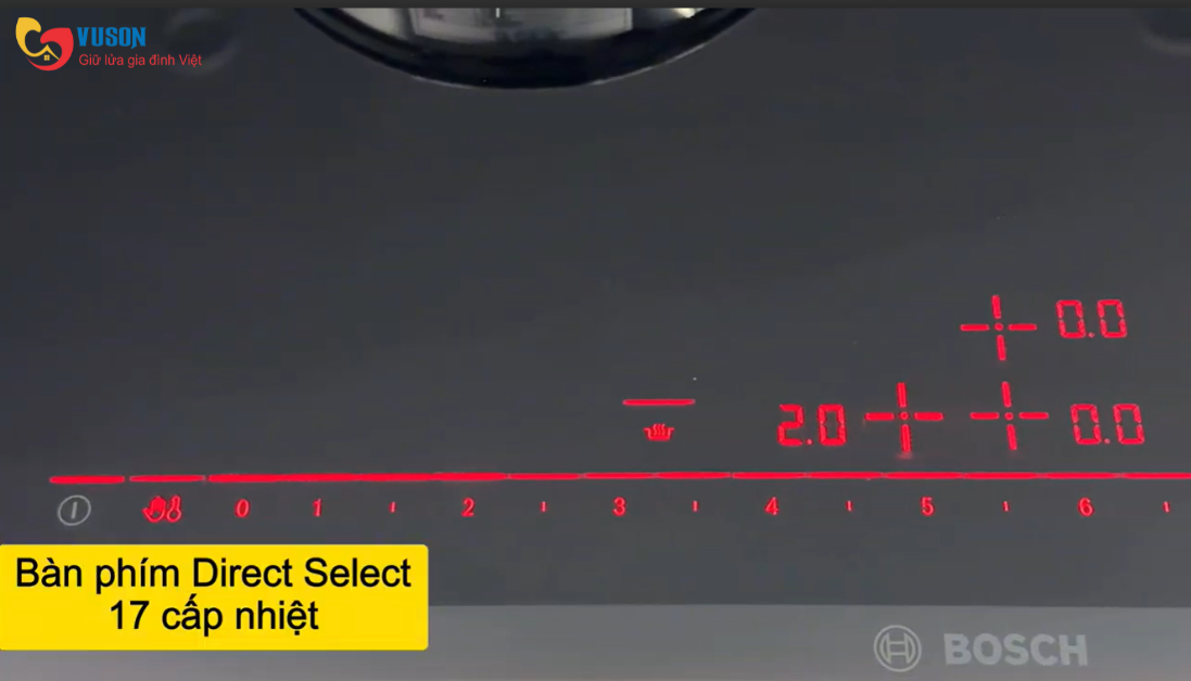 Bosch PID675DC1E Serie 8 sử dụng bảng điều khiển cảm ứng Direct Select hiện đại, giúp người dùng chạm trực tiếp vào mức công suất mong muốn mà không cần trượt hoặc bấm nhiều lần.