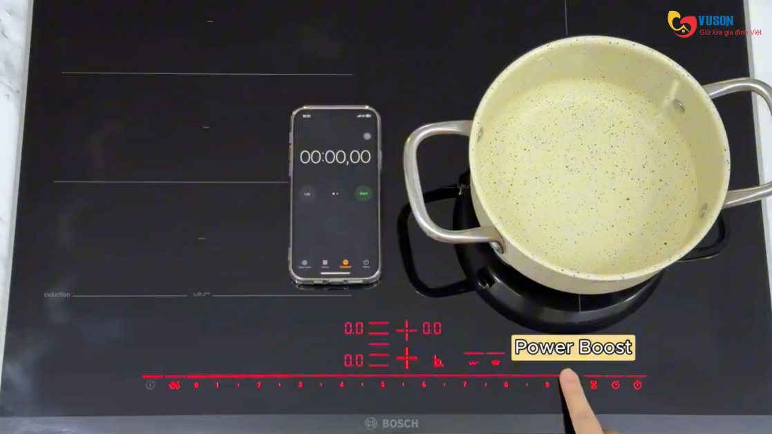 Với PowerBoost, công suất bếp được tăng cường tối đa, giúp đun sôi nước chỉ trong khoảng 2 phút.