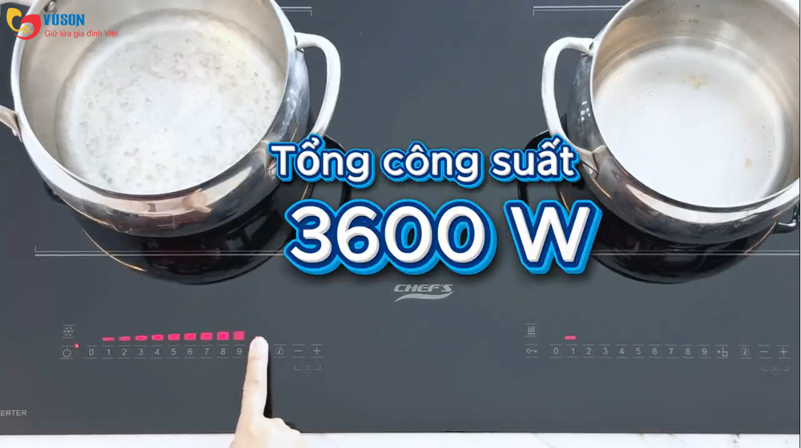 Khi kích hoạt Booster, mỗi vùng có thể đạt công suất tối đa 3000W. Tổng công suất toàn bếp là 3600W, đủ để đáp ứng nhu cầu nấu ăn nhanh trong gia đình mà không gây quá tải hệ thống điện.