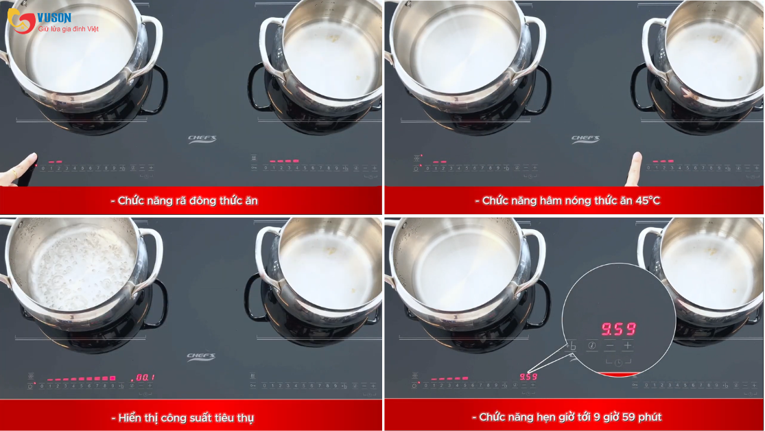 - Hẹn giờ độc lập lên đến 9 giờ 59 phút cho từng vùng nấu