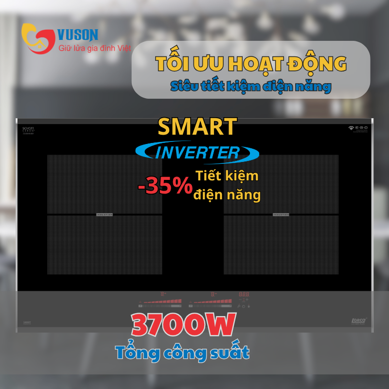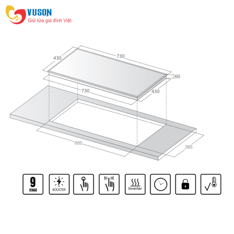 - Bếp phải: Ø 230mm/ 2300W, booster 3000W