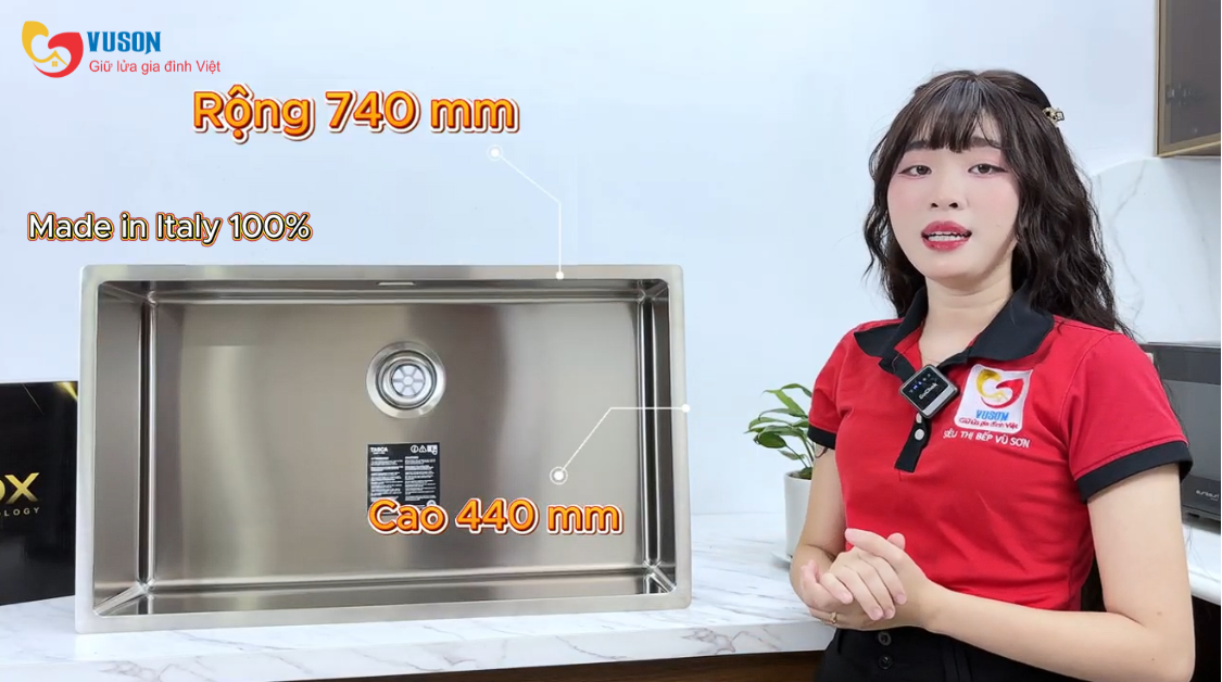 Chậu thuộc dạng một hố, với các đường nét mềm mại, cân đối, dễ dàng hòa hợp với cả không gian bếp hiện đại lẫn bán cổ điển. Kích thước lắp đặt tiêu chuẩn 740 x 440 mm giúp sản phẩm phù hợp với đa số mặt đá bếp phổ biến tại Việt Nam, không đòi hỏi xử lý kỹ thuật phức tạp khi thi công.