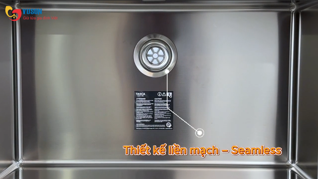 Đặc biệt, thiết kế Seamless – liền mạch giữa thân chậu, lỗ thoát tràn và bát rác giúp loại bỏ các khe rãnh dễ tích tụ vi khuẩn. Hố rác được đúc nguyên khối, hạn chế rò rỉ nước và nâng cao độ bền trong quá trình sử dụng lâu dài.