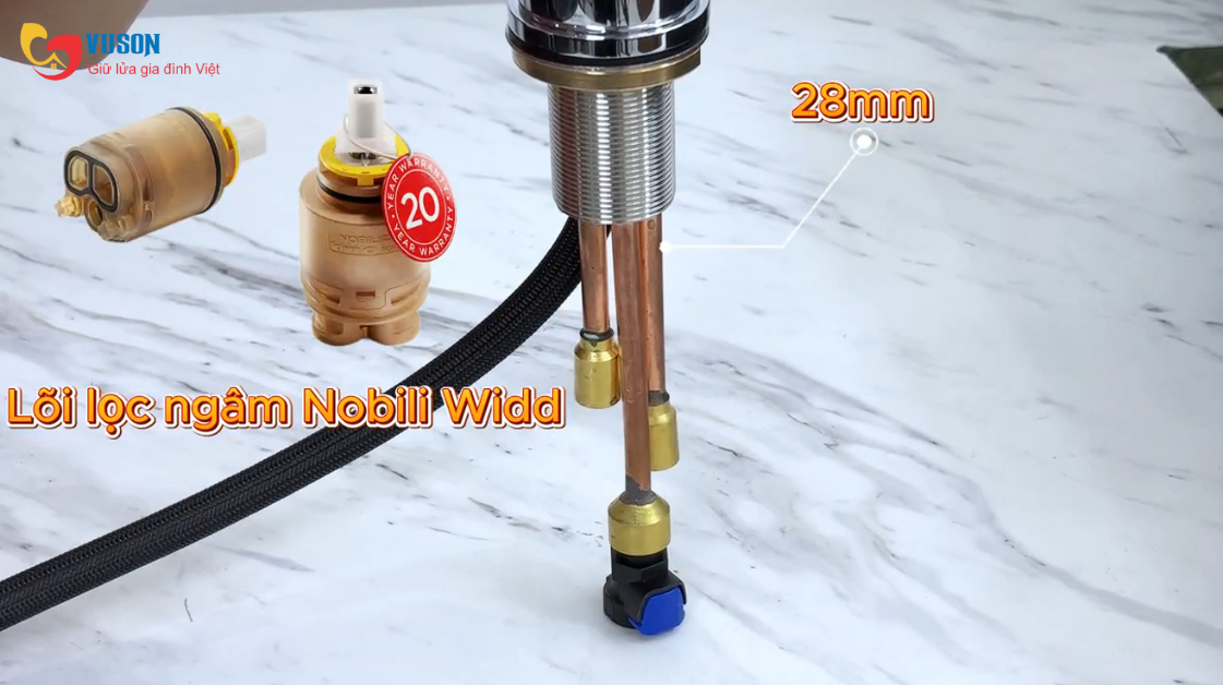 Bên trong vòi là lõi lọc ngâm Nobili Widd 28 mm, tích hợp công nghệ tiên tiến giúp kiểm soát lưu lượng nước hiệu quả, từ đó tiết kiệm nước và năng lượng trong quá trình sử dụng.