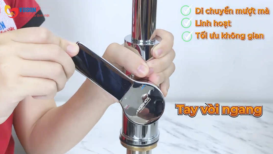 Tay vòi ngang được thiết kế tối ưu không gian, chuyển động mượt mà, kết hợp với chiều cao hợp lý giúp mọi thao tác trong bếp trở nên thuận tiện hơn.