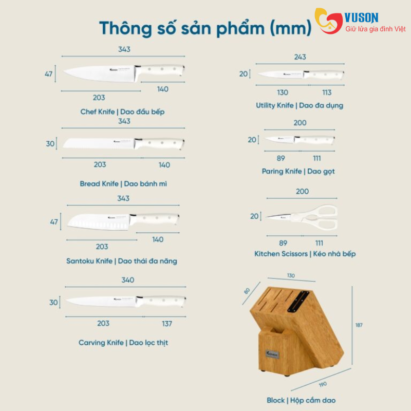 - Hộp đựng dao: Chất liệu gỗ keo gồm 7 khe cắm và 1 khe mài