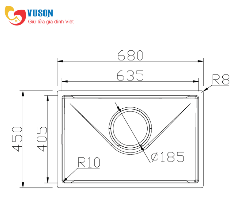 - Kích thước cắt đá lắp âm: 640R x 410S - Góc R10 mm