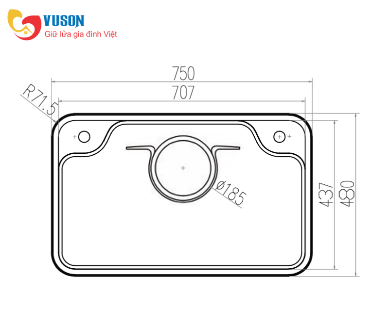 - Kích thước cắt đá lắp dương: 722R x 452S - Góc R50 mm