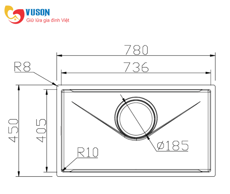 - Kích thước cắt đá lắp âm: 740R x 410S - Góc R100 mm