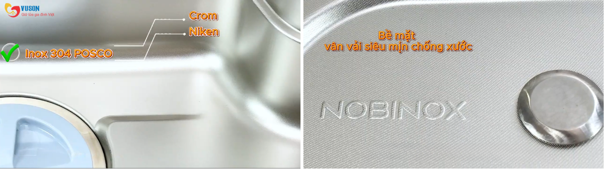 Về chất liệu, chậu rửa bát Nobinox ARVO B180 được sản xuất từ Inox 304 POSCO cao cấp, nổi tiếng với khả năng chống ăn mòn, chống hoen gỉ và an toàn cho sức khỏe. Nobinox còn ứng dụng công nghệ bề mặt vân vải siêu mịn, giúp hạn chế trầy xước, che dấu vân tay và giữ bề mặt chậu luôn sạch sẽ, lì mịn theo thời gian. Kết hợp cùng các góc bo tròn R50 mềm mại và độ dày tiêu chuẩn 1.2mm, chậu không chỉ dễ vệ sinh mà còn giảm đáng kể tiếng ồn khi xả nước, mang lại trải nghiệm sử dụng êm ái và an toàn.