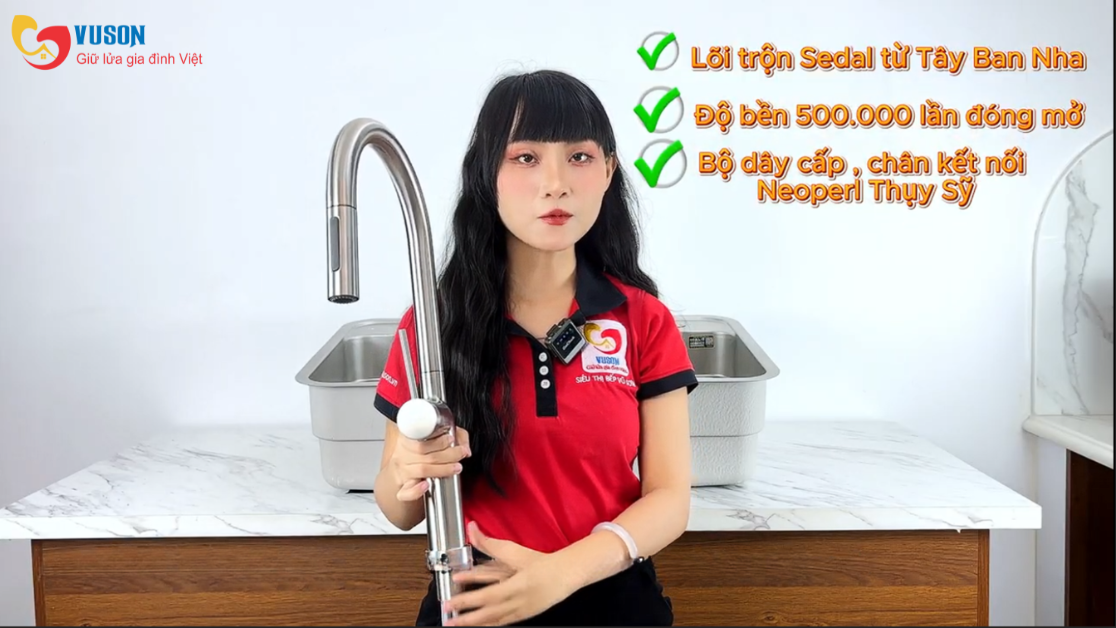 Vòi NX992 hỗ trợ hai chế độ nóng lạnh, giúp người dùng dễ dàng chuyển đổi tùy theo nhu cầu sử dụng thực tế trong gian bếp. Thiết kế vòi cao 455mm mang lại cảm giác thanh thoát, hiện đại và phù hợp với nhiều phong cách nội thất khác nhau. Phần thân vòi được hoàn thiện từ Inox 304 cao cấp, vừa đảm bảo độ bền lâu dài trong môi trường ẩm ướt, vừa an toàn cho nguồn nước sinh hoạt của gia đình.
