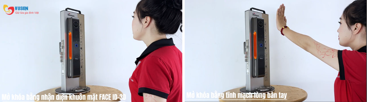Face ID 3D cho phép nhận diện khuôn mặt theo chiều sâu, mở cửa nhanh chóng mà không cần thao tác chạm. Trong khi đó, công nghệ khóa cửa Demax nhận diện lòng bàn tay sử dụng sơ đồ tĩnh mạch – một trong những phương thức bảo mật khó làm giả nhất hiện nay.