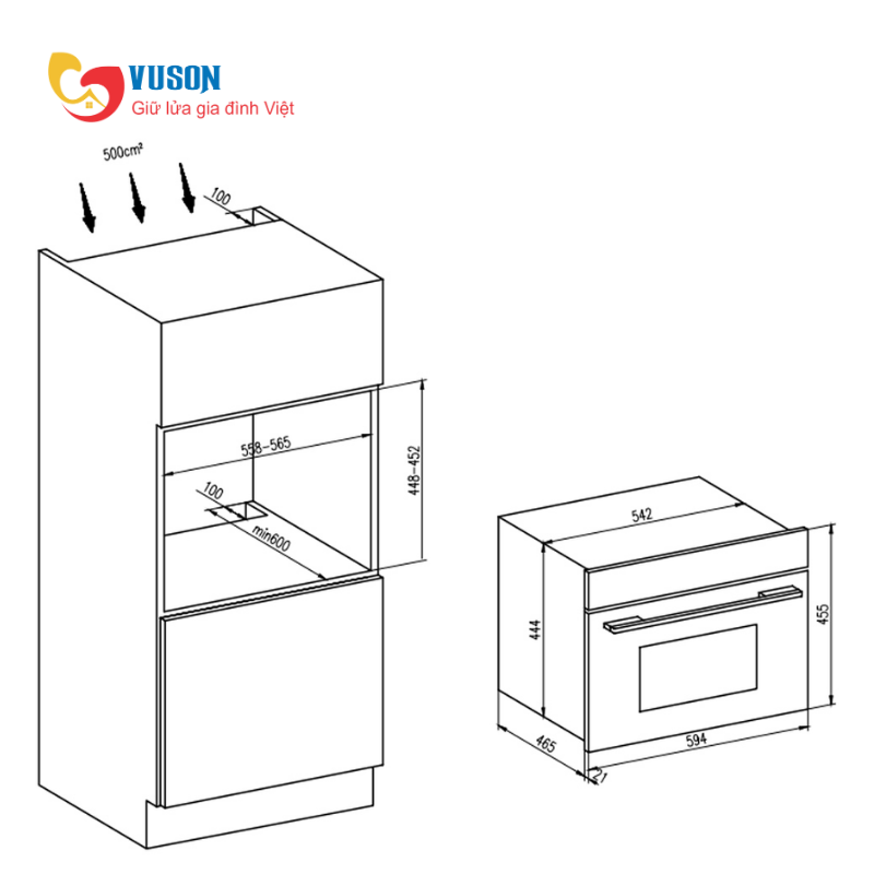 - Kích thước lắp đặt: (558-565)R x min 600S x (448-452)C mm