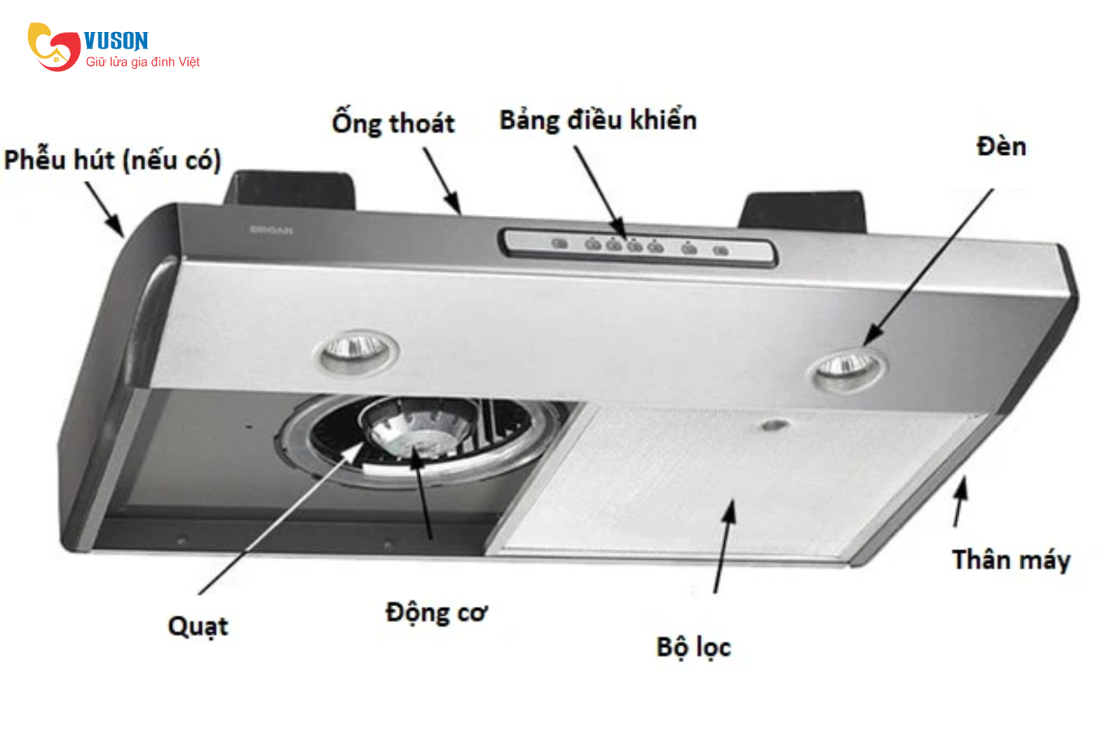 Hiểu rõ cấu tạo của máy hút mùi sẽ giúp bạn biết cách chọn, sử dụng và vệ sinh đúng cách. Một chiếc máy hút mùi tiêu chuẩn thường gồm những bộ phận chính sau: