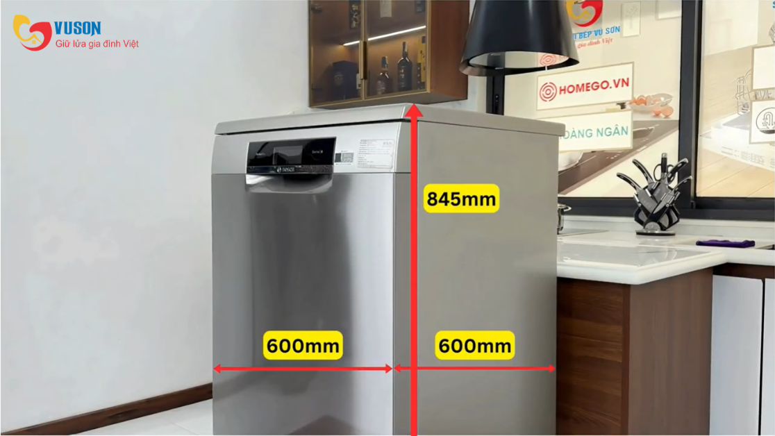 Với kích thước tiêu chuẩn 600 x 600 x 845 mm, Máy rửa bát Bosch SMS8YCI01E Serie 8 chính hãng có thể lắp độc lập hoặc âm tủ, phù hợp cho cả căn hộ nhỏ hay nhà bếp cao cấp.