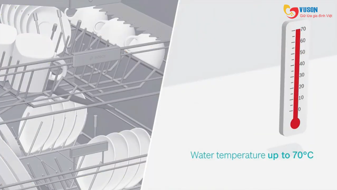 Trong chu trình tráng cuối, máy tăng nhiệt độ nước lên đến 70°C và duy trì trong 10 phút, tiêu diệt 99,99% vi khuẩn và mầm bệnh.